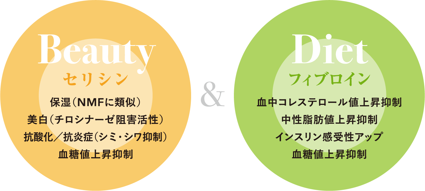 蚕の作る繭糸は、約75%をフィブロインという繊維状のタンパク質と、その外側、約25%を包み込んでいるセリシンというタンパク質の2種類のタンパク質で構成されています。